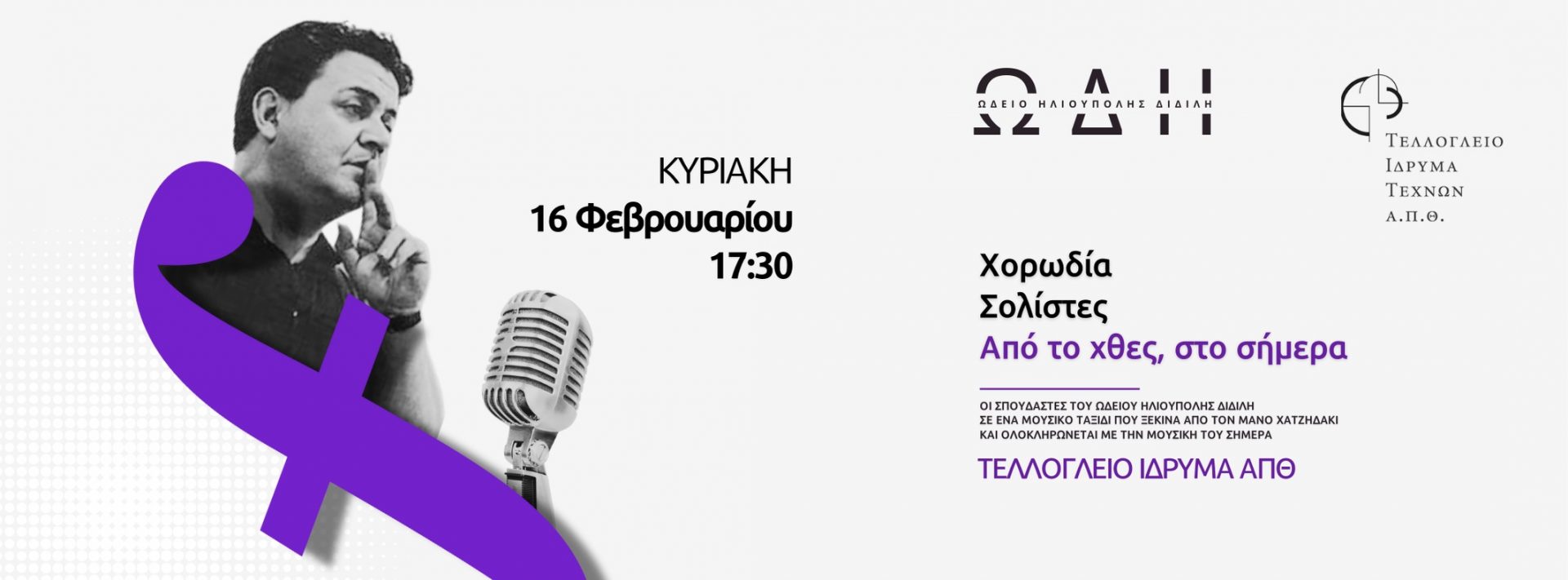 Το Ωδείο Ηλιούπολης Διδίλη σας προσκαλεί την Κυριακή, 16 Φεβρουαρίου 2025, σε ένα μουσικό ταξίδι στον χρόνο. Με τραγούδια από το χθες και το σήμερα, η χορωδία και οι σολίστες του Ωδείου μας θα ερμηνεύσουν τραγούδια του Μάνου Χατζηδάκι, αλλά και σύγχρονων ξένων και Ελλήνων μουσικών.