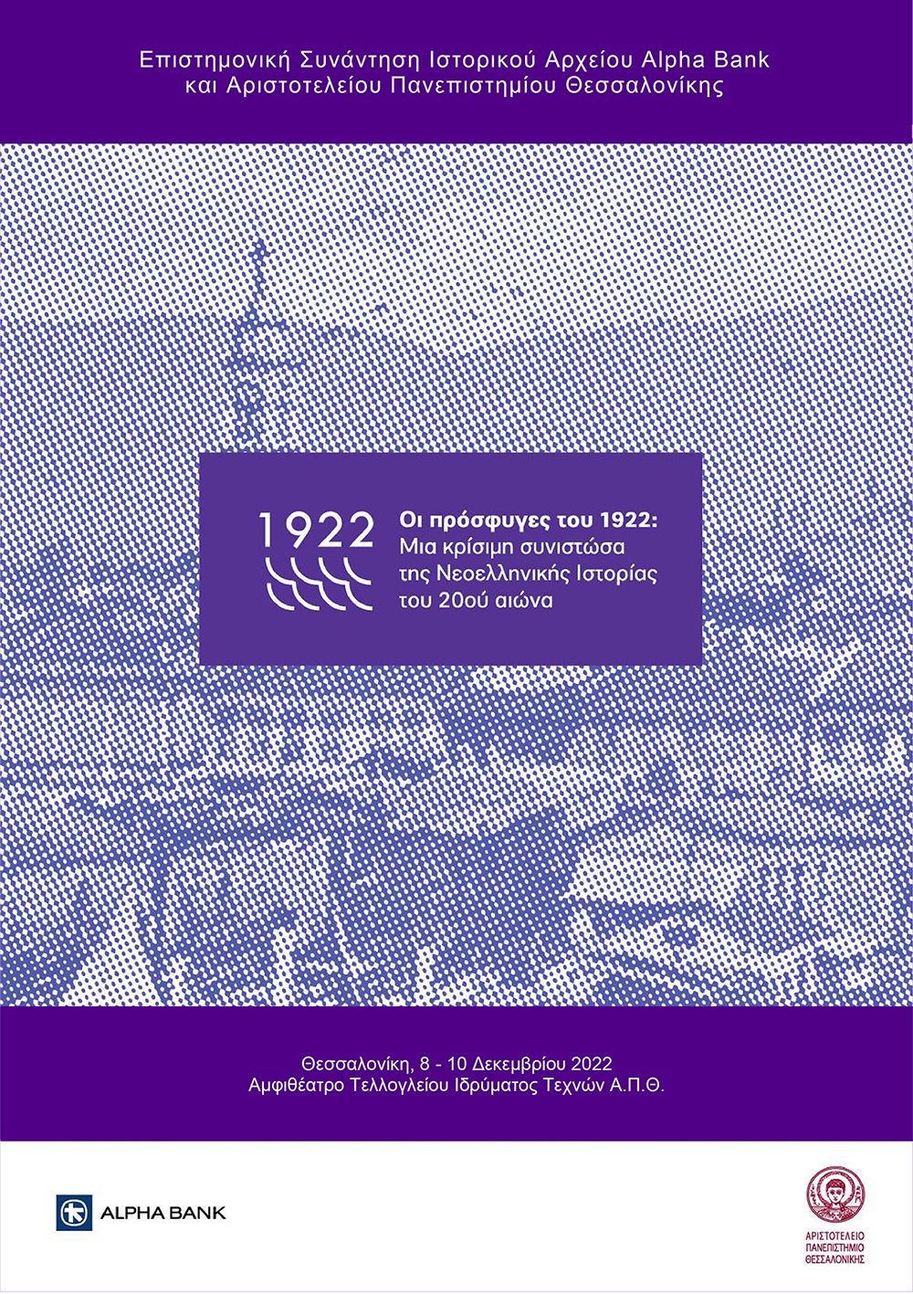 Το Ιστορικό Αρχείο της Alpha Bank διοργανώνει από κοινού με το Αριστοτέλειο Πανεπιστήμιο Θεσσαλονίκης την επιστημονική συνάντηση «Οι πρόσφυγες του 1922: Μια κρίσιμη συνιστώσα της Νεοελληνικής Ιστορίας του 20ού αιώνα», με αφορμή την επέτειο των 100 χρόνων από τη Μικρασιατική Καταστροφή. Η συνάντηση θα πραγματοποιηθεί στη Θεσσαλονίκη, μια πόλη που δέχτηκε πολύ μεγάλο αριθμό προσφυγικών πληθυσμών την περίοδο της Μικρασιατικής Καταστροφής.