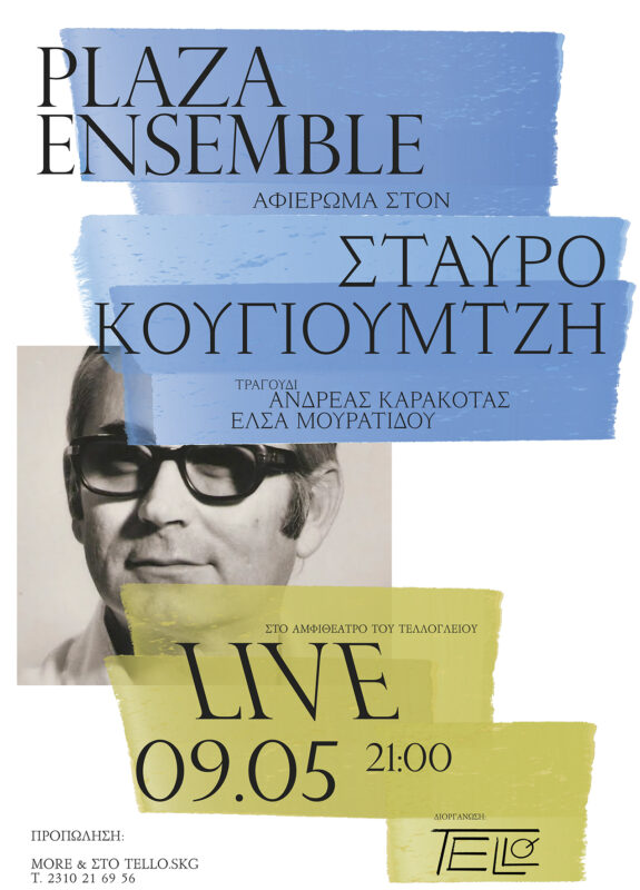 Το Plaza Ensemble, ένα από τα πιο διακεκριμένα μουσικά “σχήματα” της πόλης μας, παρουσιάζουν ένα αφιέρωμα στον Σταύρο Κουγιουμτζή, με γνωστά, διαχρονικά και αγαπημένα τραγούδια του σπουδαίου Έλληνα συνθέτη (“Κάπου νυχτώνει”, “O ουρανός”, “Ντύλαν Τόμας”, ¨Μην μου θυμώνεις μάτια μου”, “‘Oλα καλά”, “Tώρα που θα φύγεις”, κ.α.) ερμηνευμένα μέσα από το ενορχηστρωτικό φίλτρο του Plaza Ensemble και δύο κορυφαίες ελληνικές φωνές, του Ανδρέα Καρακότα, συνεργάτη του συνθέτη και της Έλσας Μουρατίδου.