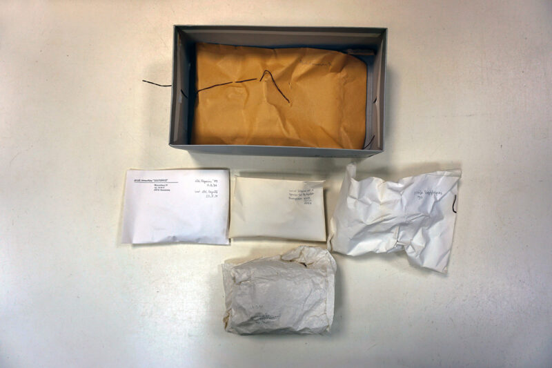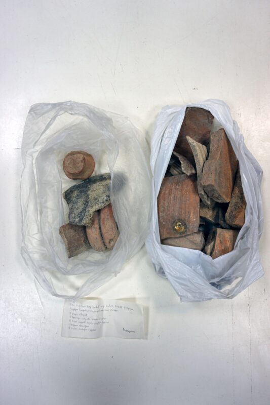 «Τα “αρχαία” του Ντίνου όπως τα είδε ο φακός του Άρι Γεωργίου αποτυπώνουν το πιο αληθινό, τρυφερό και συγκινητικό πορτρέτο του Χριστιανόπουλου: μια συλλογή από ενθυμήματα λογής-λογής, όπου τα όστρακα, τα κεραμικά θραύσματα κάθε εποχής που συνάντησε στον δρόμο του, ή του τα χάρισαν φίλοι ακριβοί από Θεσσαλονίκη, φυλαγμένα ανάμεσα σε κουμπιά, πολύχρωμες χάντρες, φυλαχτά, κουρελάκια, δεκάρες, χαρτονομίσματα, είναι πραγματικά ψηφίδες από τα «μικρά και ταπεινά» που ήταν ο κόσμος του. Φυλαγμένα σε κουτιά από Κουραμπιέδες του Τερκενλή, ή Λουκούμια Σύρου του Πάσσαρη, ξεπροβάλλουν μέσα από νάυλον σακούλες, φακελάκια συχνά δεύτερης χρήσης, που συνοδεύονται από σημειώσεις με τη χαρακτηριστικά προσεγμένη γραφή του να δίνει το στίγμα τους: οδός Πειραιώς, οδός Λαγκαδά, οδός Ολυμπιάδος, Επταπύργιο, χάρισμα της Σούλας Πιτέρη, της Βάνας Χαραλαμπίδου, της Ελένης Λαζαρίδου κ.ο.κ. Η σχολαστική αναφορά του Χριστιανόπουλου στην προέλευσή τους, ποιος του το χάρισε, πού το βρήκε, με το συγκλονιστικό «από πού;» όταν δεν θυμάται, παίρνει άλλη διάσταση», σημειώνει η Γενική Διευθύντρια του Τελλογλείου και Ομ. Καθηγήτρια ΑΠΘ, Αλεξάνδρα Γουλάκη-Βουτυρά, στον κατάλογο της έκθεσης.
