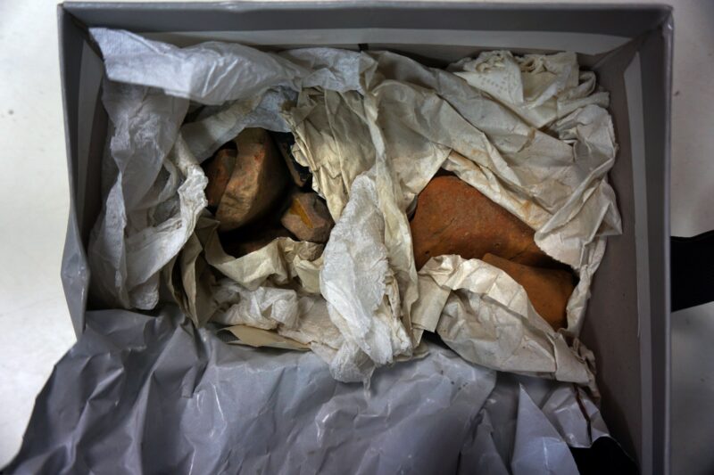 Ο Άρις Γεωργίου στον κατάλογο της έκθεσης επισημαίνει μεταξύ άλλων ότι «πέντε-έξι παλιά χαρτοκιβώτια, κάποια ευτελή πλαστικά κουτιά, random νάυλον σακκούλες, παλιές συσκευασίες ζαχαροπλαστείων, τσαλακωμένοι φάκελλοι αλληλογραφίας και λογαριασμών, χύμα ψιλόχαρτα ή σελίδες περιοδικών και εφημερίδων, δεματάκια συχνά σφιγμένα με σπάγγο ―πάντοτε επιμελημένος φιόγκος, ποτέ δυσεπίλυτος κόμπος― κάποτε υπό γηράσκοντα ανενεργά λαστιχάκια, όλα τους, ευτελώς, εκ του προχείρου, όχι πάντως άνευ κάποιας μεθόδου από μέρους του, στεγάζουν, αποθησαυρίζοντάς την, διά της δικής του χειρός, την «συλλογή αρχαιοτήτων» του Ντίνου Χριστιανόπουλου». Ο ίδιος τονίζει τα εξής: «Αυτό ακριβώς επιτελεί το εγχείρημα της φωτογραφικής καταγραφής των «πολύτιμων» λίθων και κεράμων, των ευλαβικώς παρά Ντίνου συλλεχθέντων και επιμελώς υπομνηματισθέντων. Η ουσιαστική αξία των “αρχαιοτήτων του Ντίνου” ανιχνεύεται στην “μουσειογραφική σύνταξη” του θησαυρού που συνιστούν».