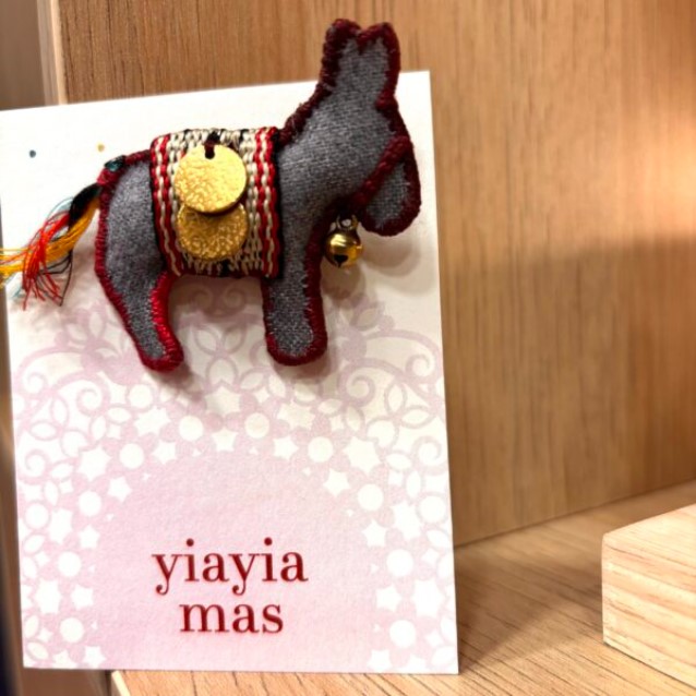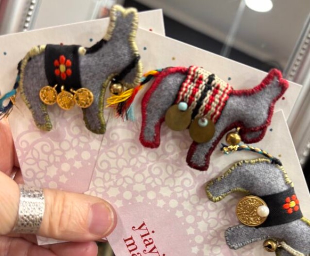 Χειροποίητη καρφίτσα από τσόχα και κλώστη διακοσμημένη με κουδουνάκια και φλουράκια.