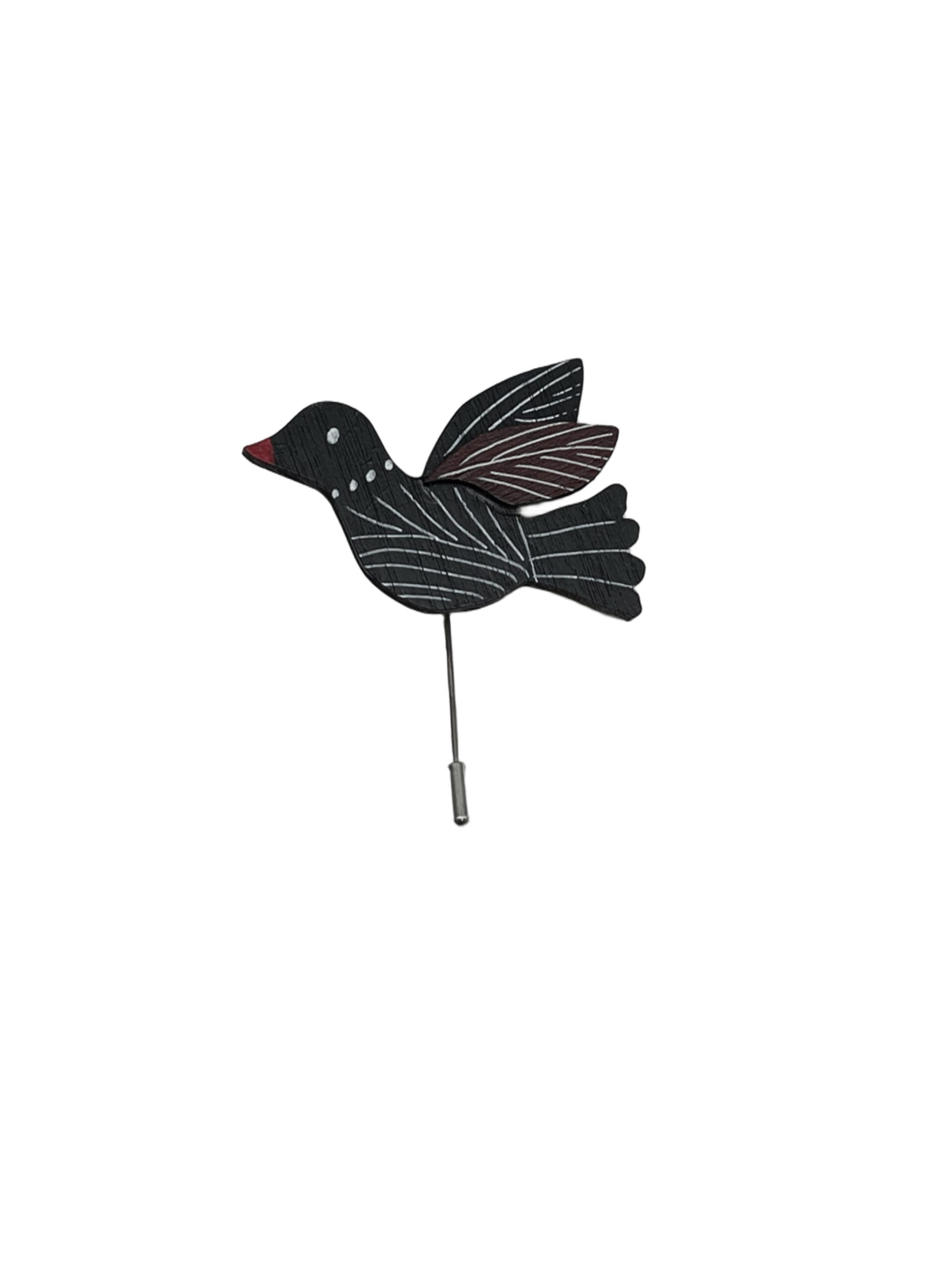 Ξύλινη καρφίτσα σε σχήμα πουλιού, με χειροποίητη λεπτομέρεια και μοντέρνα γεωμετρική αισθητική.
